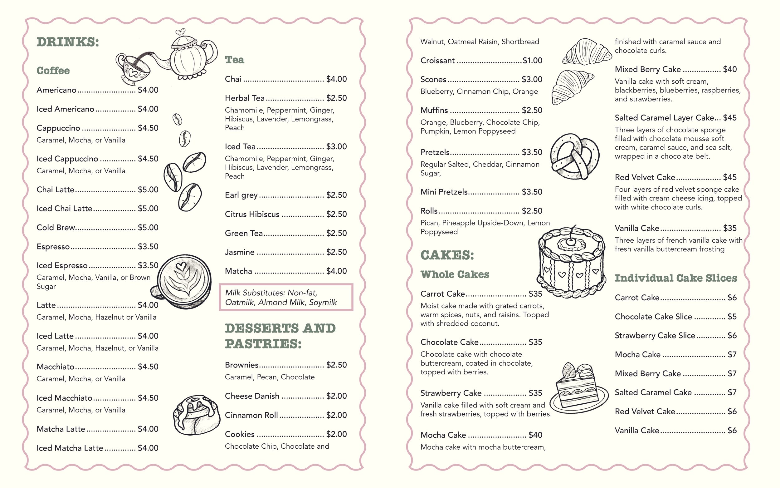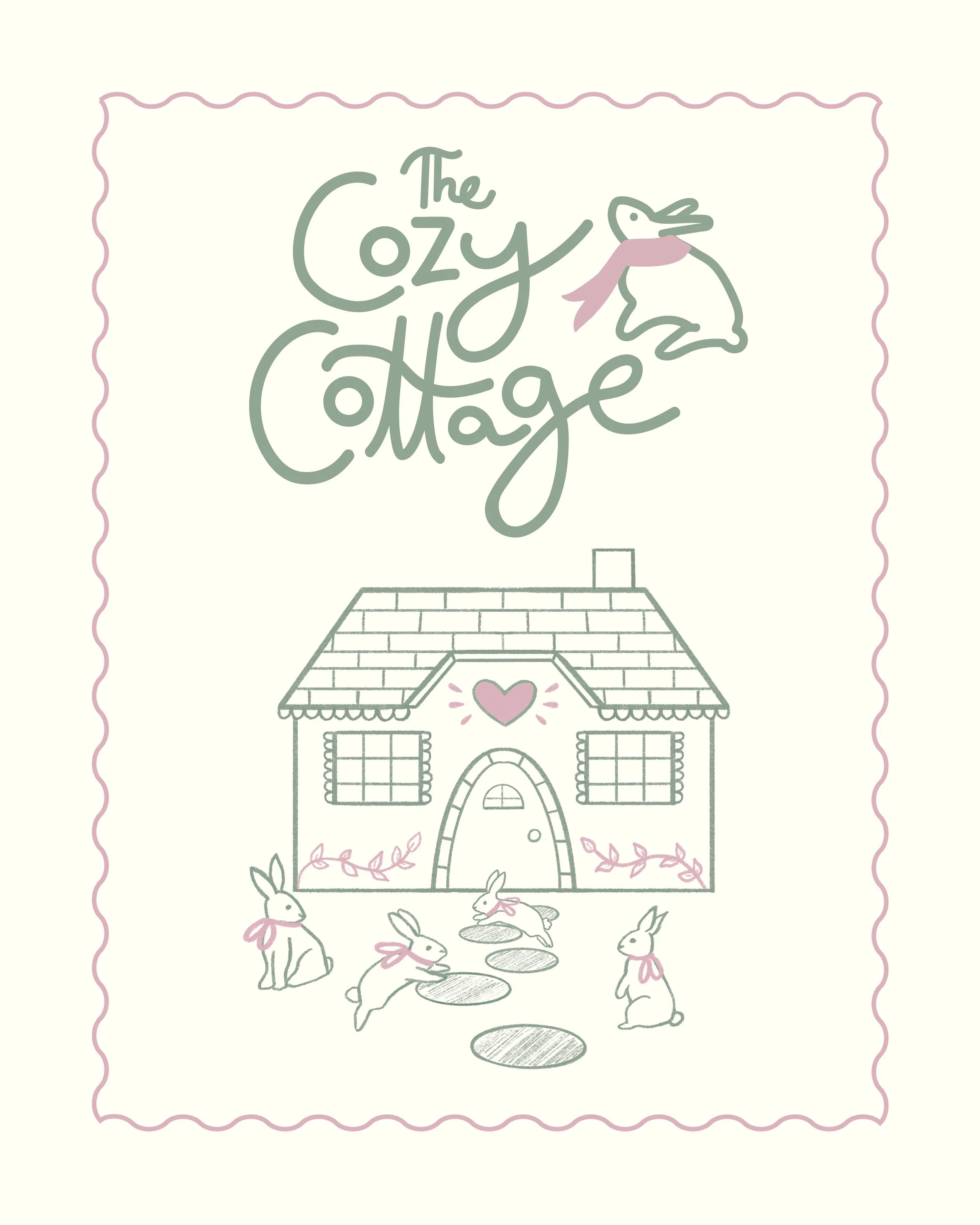This design is a menu for a fictional cafe named The Cozy Cottage. This cafe specializes in treats like pastries, deserts, and coffee. It has a homey, warm atmosphere made to resemble a cottage. I reflected this comforting feeling through design choices including using soft colors, hand-drawn illustrations, and adding a whimsical bunny motif.